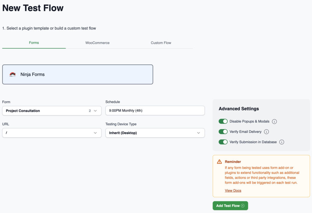 When you create a new test flow, CheckView automatically scans your connected WordPress site to detect any supported form plugins. Detected plugins will appear as available test flow templates.