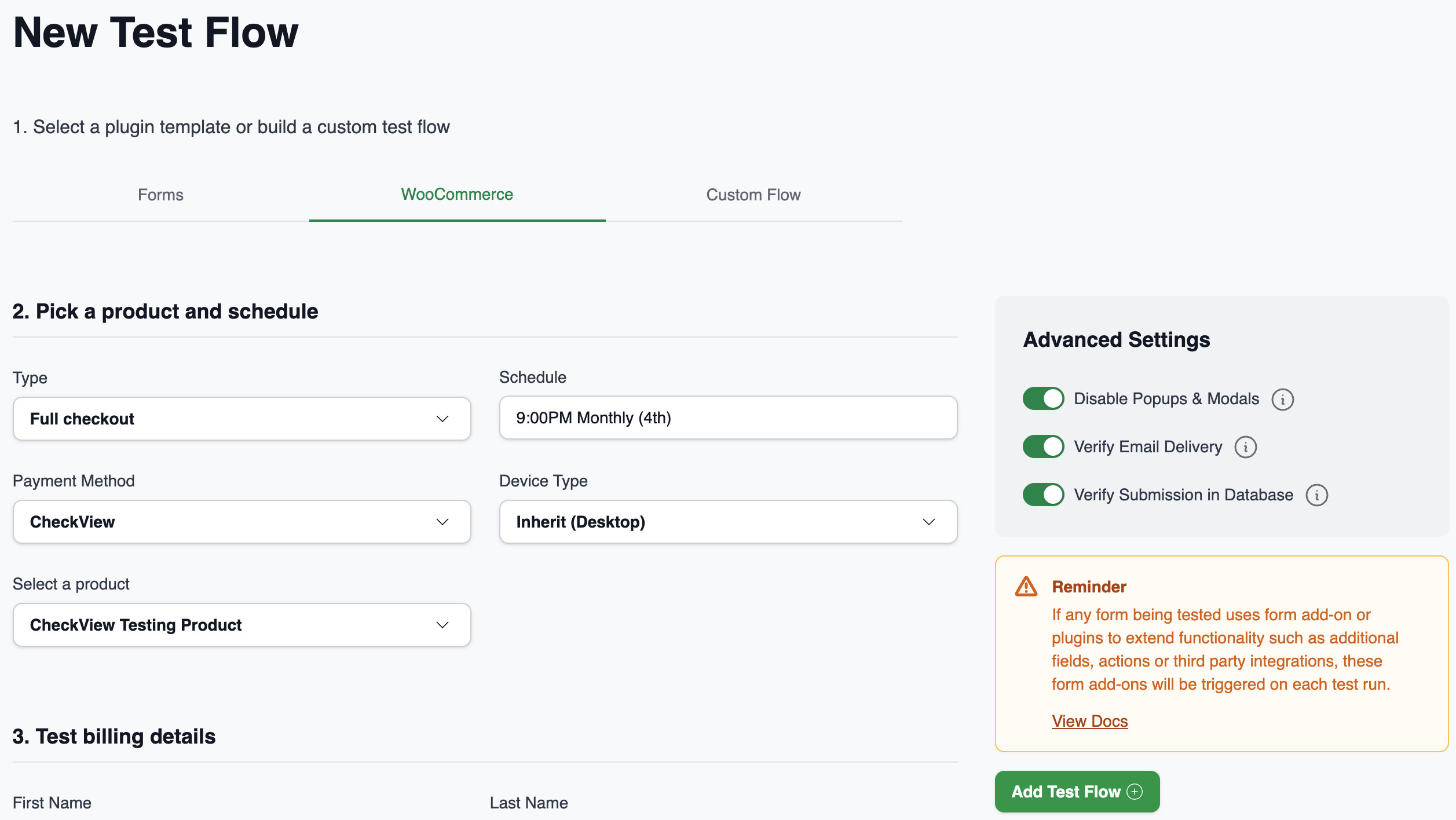 CheckView makes it easy to automate checkout testing for your WooCommerce store, helping you ensure your add-to-cart and checkout processes work reliably with every update. Follow the steps below to create and schedule your WooCommerce test flow.