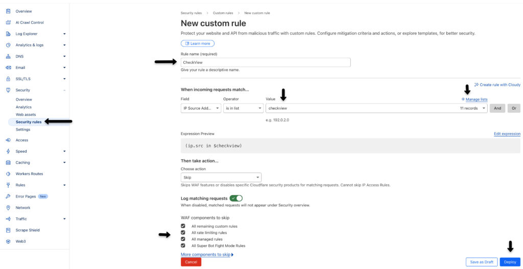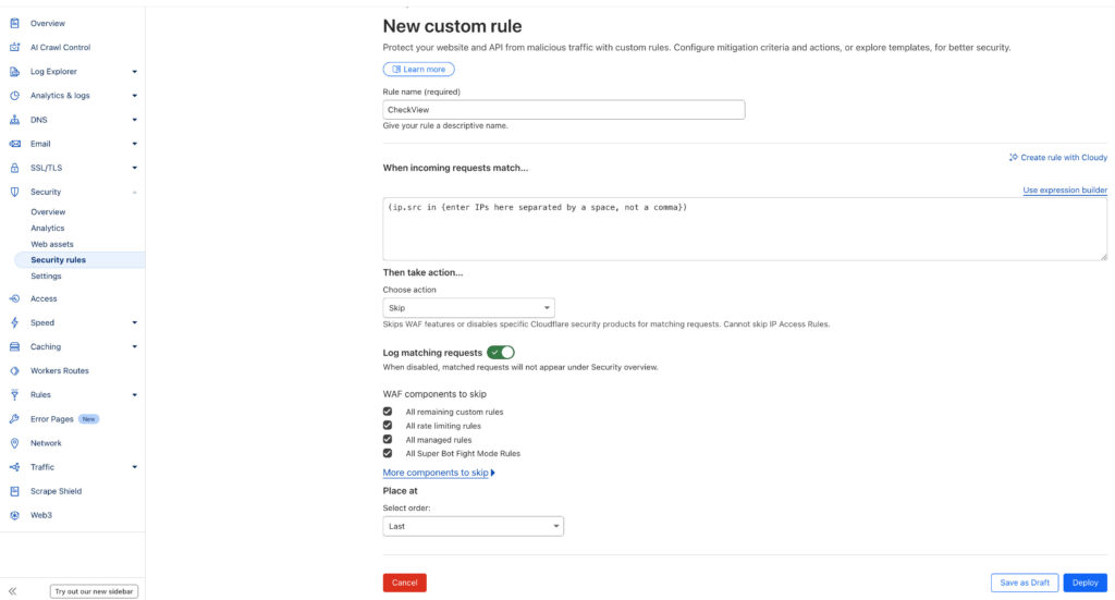 Set Action: Choose Action: “Skip”, and check all available WAF components to skip checkboxes such as All remaining custom rules, All rate limiting rules, All managed rules, All Super Bot Fight Mode Rules, etc.