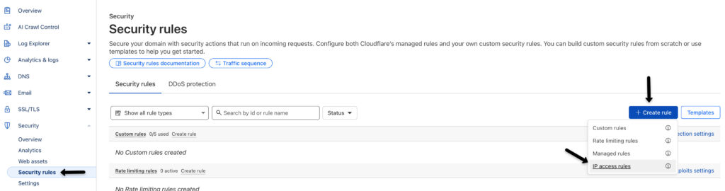 Create Rule: Click on Create rule and select IP access rules